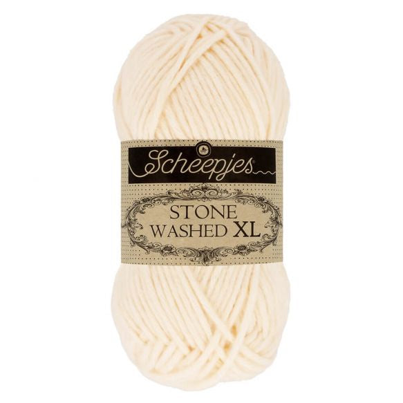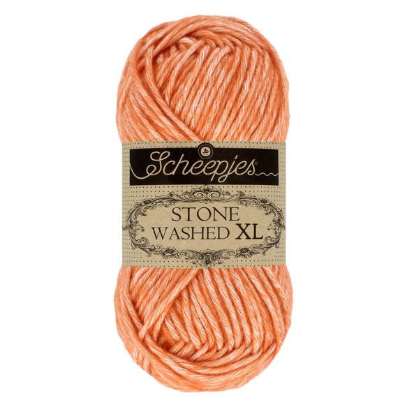 Scheepjes Stone Washed XL is, just like Scheepjes Stone Washed, a high-quality cotton-acrylic blend in Sport weight, which feels silky soft to the touch despite the tough name. The characteristic stonewashed appearance is created by the combination of ecru cotton with colourful and fluffy acrylic fibres. The yarn is made from 70% Cotton and 30% Acrylic, which gives it the breathable quality of cotton, but is strong and easy to care for thanks to the acrylic. The recommended needle size is 5 mm. One ball weighs 50 grams and holds 75 metres of yarn.